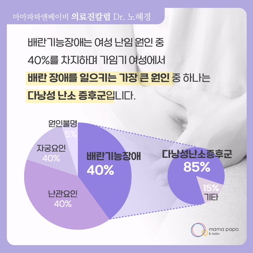 배란은 매달 규칙적으로 성장한 성숙난자가 난포를 뚫고 배출되는 과정으로 배란 기능장애가 있으면 월경주기가 35일 이상으로 길어지는 희발월경이나 3개월 이상 월경을 하지 않는 무월경까지 사람마다 다양한 정도로 증상이 나타나게 됩니다. 배란기능장애는 여성 난임 원인 중 40%를 차지하며 가임기 여성에서 배란장애를 일으키는 가장 큰 원인 중 하나는 다낭성 난소 증후군입니다.