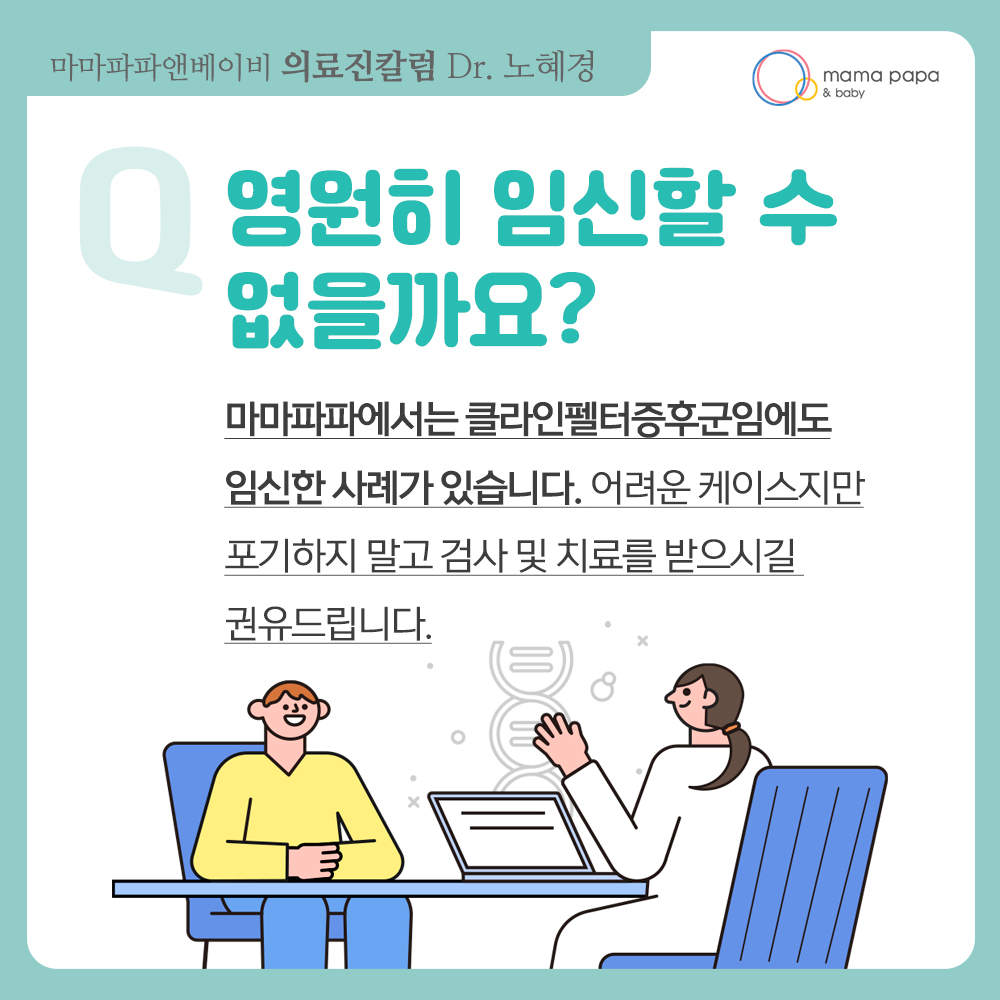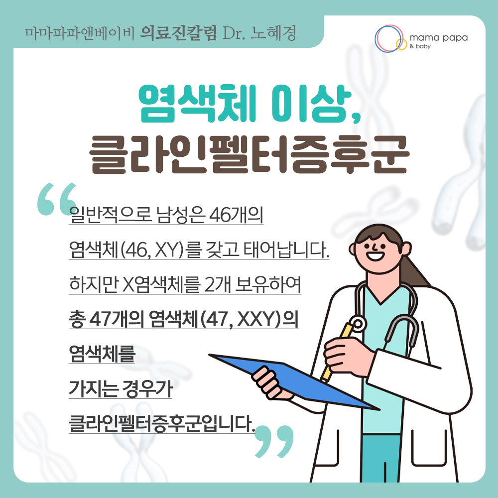 안녕하세요.마마파파앤베이비 산부인과노혜경 과장입니다.오늘은 '클라인펠터증후군'에 대해설명해 드...