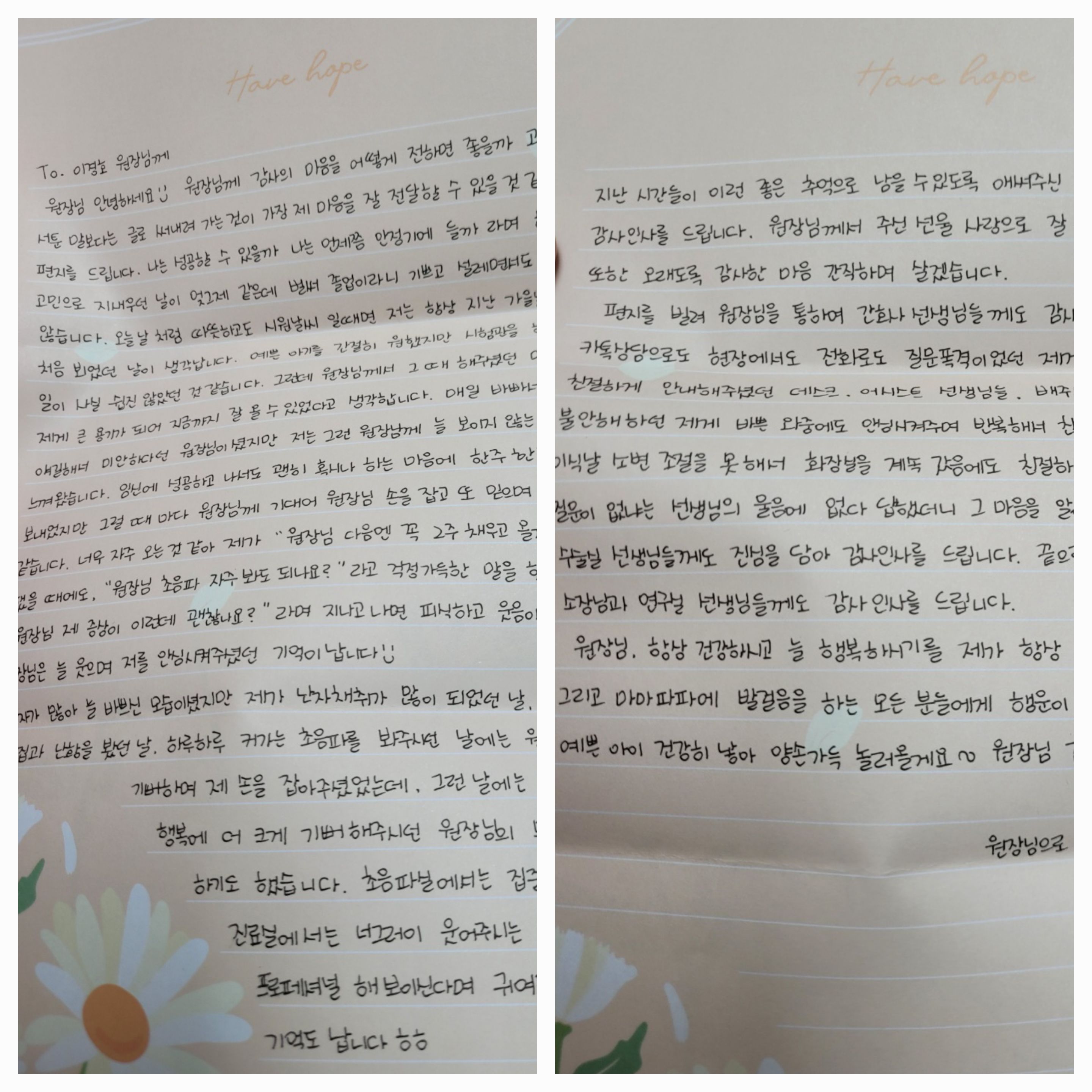 원장님 안녕하세요! 너무 감사한 마음을 어떻게 전달하는 게 좋을까 고민하다 말보단 글이 더 잘써질것 같아 몇년만에 편지지도 샀어요....