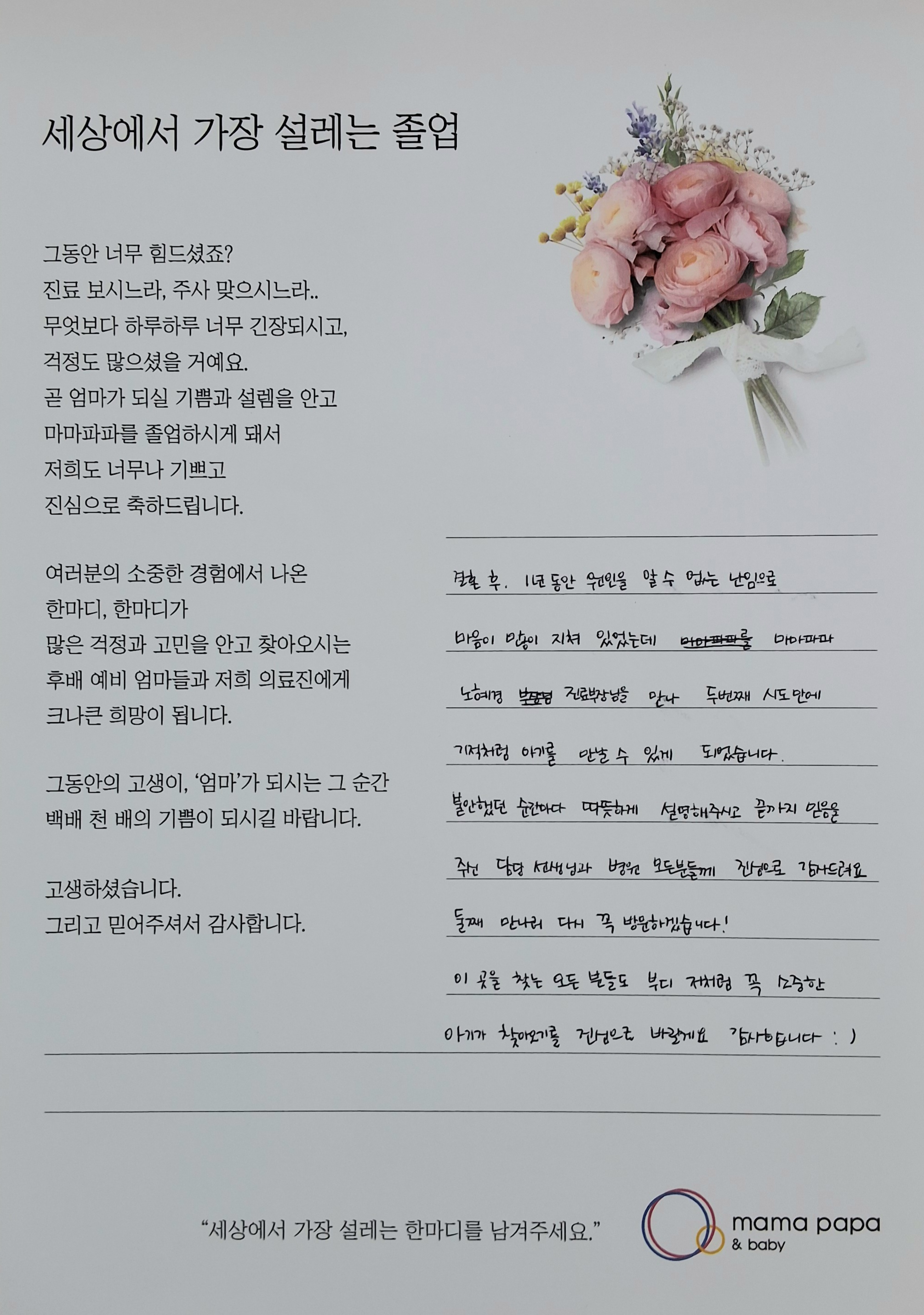 그동안 너무 힘드셨죠? 진료보느라, 주사 맞으시느라..하지만 곧 엄마가 되실 기쁨과 설렘을 안고 마마파파를 졸업하시게 돼서 너무나 ...