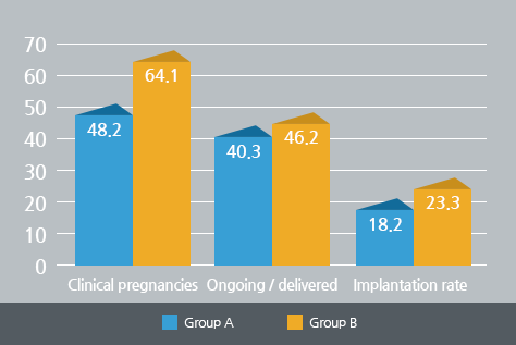 The overall incidence of retained embryos during the study period was 5.5% (38 out of 685) following a clean initial embryo transfer. The mean age of the patients (33.8 ± 4.1 vs. 33.7 ± 3.4), mean number of retrieved oocytes (13.0 ± 7.9 vs. 11.2 ± 7.1), fertilized oocytes (8.1 ± 5.4 vs. 7.1 ± 5.0) and the embryos transferred (4.0 ± 1.1 vs. 4.1 ± 0.9) were comparable in patients with and without retained embryos. The 842 embryo transfers performed during the study period resulted in 412 pregnancies (51.3%), of which 342 proved to be ongoing pregnancies (40.6%). The implantation rate was 18.4%. Pregnancy outcomes including clinical pregnancy rates (64.1% vs. 48.2%; P< 0.01), implantation rates (23.3% vs. 18.2%; P< 0.01) and spontaneous abortion rates (28.0% vs. 16.3%; P< 0.01) were significantly higher for group B than for group A. Multiple pregnancy rates (44.0% vs. 41.4%) were not significantly different between patients with and without retained embryos.