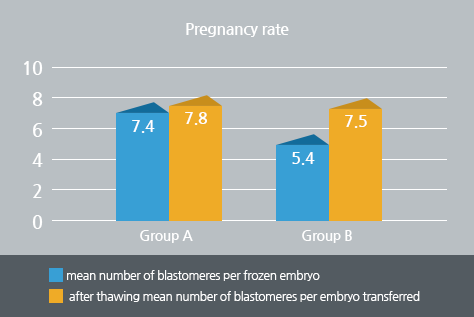 There were no differences between both groups in patient age (35±4.4 in group A vs. 34±3.9 in group B), endometrial thickness (9.2±1.9 vs. 9.5±2.0), fully intact rates (69.2% vs. 66.9%), and survival rates (83.6% vs. 81.3%). And there was difference in the mean number of blastomeres per frozen embryo between groups (7.4±1.5 vs. 5.4±1.2). But after thawing mean number of blastomeres per embryo transferred did not differ between groups (7.8±1.4 vs. 7.5±1.6). Also the two groups did not differ as to pregnancy rates (41.8% vs. 39.2%).