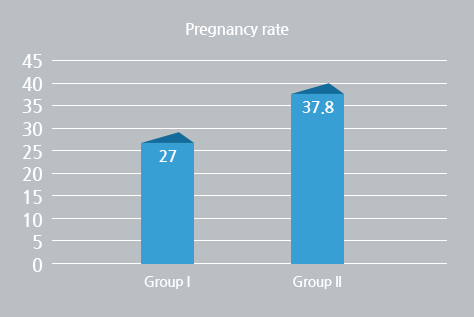 During the study period the 518 FET performed and resulted in 177 pregnancies (34.2%). There was no difference between both groups in patient age (34.0±4.4 in group 1 and 34.6±4.0 years in group 2) and endometrial thickness (9.2 ±2.0 and 9.8 ±2.0 mm). Embryo survival to freezing-thawing (78.9±20.5% and 80.7±20.0%), the number of embryos transferred per patient (2.2±0.4 and 2.2±0.4) and embryo quality were also comparable in both groups. However, the pregnancy rate was significantly higher in group 2 (37.8%) than group 1 (27.0%, p=0.018).