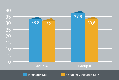 There were no differences between both groups in patient age (35±4.4 in group A vs. 36±3.9 in group B), endometrial thickness (9.2±2.1 vs. 9.5±1.8), fully intact rates (69.2% vs. 66.9%), and survival rates (83.6% vs. 81.3%). And numbers of good quality embryos transferred were similar for the GnRH agonist and GnRH antagonist groups(57.5% vs. 60.5%). Pregnancy and ongoing rates were 33.8% vs. 37.3% and 32.0% vs. 33.8%, respectively, which was not statistically significantly different