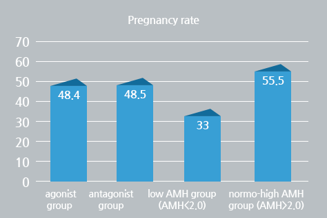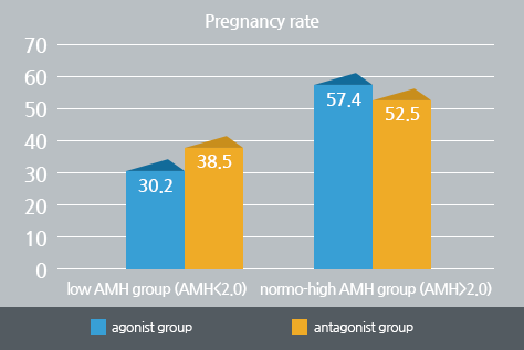 The study included 1413 IVF cycles from June 2010 to December 2012, controlled ovarian hyperstimulations were performed with GnRH agonist protocol (n=886) or GnRH antagonist protocol (n=527). The patients were divided into two groups according to serum AMH level (AMH<2.0 or >2.0 ng/ml). In each group, we analysed pregnancy rates in GnRH agonist and antagonist cycles. Patients’ age was higher in low AMH group than normo-high AMH group (38.0 vs. 34.5) and other demographics (infertility causes, period, etc.) had no differences.