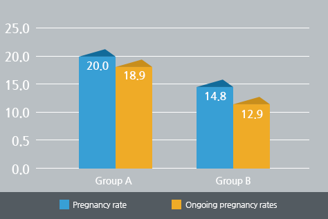 In each group, age (34.1±3.3 vs. 33.7±3.0) and other demographics did not show significant differences. Total pregnancy rate was 15.3% (327/2142) and ongoing pregnancy rate was 13.4% (287/2142). There were significant differences between group A and B in the pregnancy rate [20.0% (35/175) vs. 14.8% (292/1967), p=0.003] and ongoing pregnancy rate [18.9% (33/175) vs. 12.9% (254/1967), p=0.001].