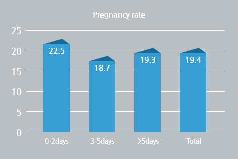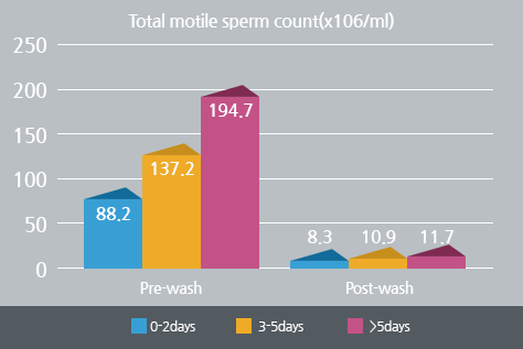 The whole ejaculate was prepared for insemination using a technique of density gradient separation with centrifugation. Ejaculatory period before IUI was divided into 3groups (0-2 days, 3-5days, >5 days).