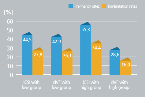 There were no differences between the Low and High groups in the characteristics of the patients; mean age of the patients (36.5±3.9 vs. 36.7±3.8) and male (38.2±4.2 vs. 38.5±3.6), mean number of retrieved oocytes (8.7±5.1 vs. 8.7±5.6), endometrial thickness (10.0±2.2 vs. 10.3±2.2), and mean number of ET (1.9±0.4 vs. 1.9±0.4). Also no difference was observed between the two groups in the clinical outcomes; fertilization rate (76.9 vs. 80.1%), pregnancy rate (44.3 vs. 49.2%), and abortion rate (11.1 vs. 13.1%). In the Low group, the pregnancy and implantation rates (44.5 and 27.8%) of ICSI group were not different from the rates (42.9 and 26.1%, respectively) of conventional IVF group. However, in the High group, the pregnancy and implantation rates (55.3 and 34.4%) of ICSI group were significantly higher than the rates (28.6 and 16.0%, respectively, P<0.01) of conventional IVF group.